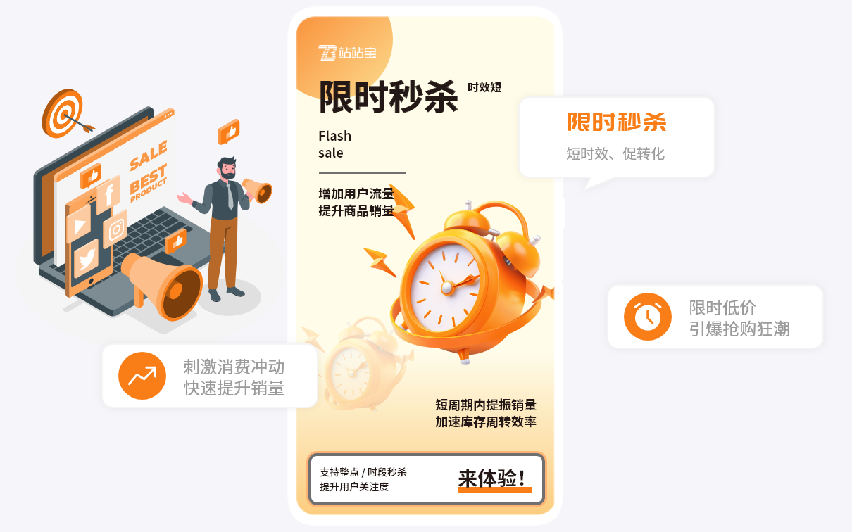 限时秒杀是商家以短期高优惠为核心的促销活动。商家设定固定活动时段与超低秒杀价,消费者需在限时内快速抢购目标商品,帮助商家借助 “限时”“低价” 特性,快速激发用户购买紧迫感,实现商品瞬时销量提升,同时吸引流量、活跃用户,助力扩大品牌曝光与后续转化。
