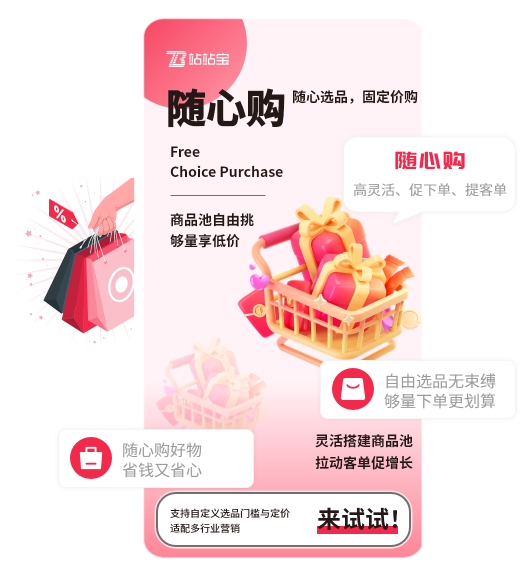 随心购是以 “灵活选品 +固定定价” 为核心的营销模式。商家搭建商品池,设定选品数量门槛与固定成交价,用户无需受固定组合限制,按喜好选品,数量达标即可优惠价购买。对用户而言,既避免被迫买不需要的商品,又能降低消费成本;对商家,可引导多买提升客单价,吸引新客、留存老客,促成良性消费循环。